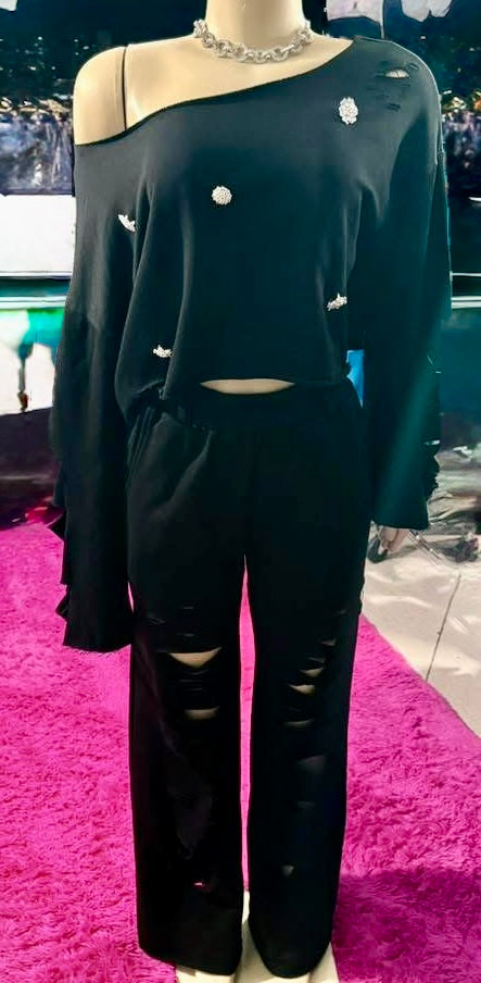 Off shoulder top with pants. Distressed w/ pockets. Brooches are removable.